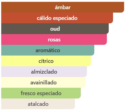 | ACORDES | ALMIZCLADO, ÁMBAR, AROMÁTICO, ATALCADO, AVAINILLADO, CÁLIDO ESPECIADO, CITRÍCO, FRESCO ESPECIADO, OUD, ROSAS |